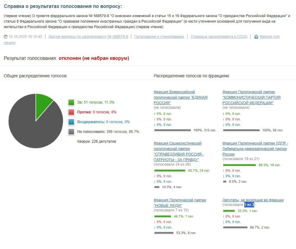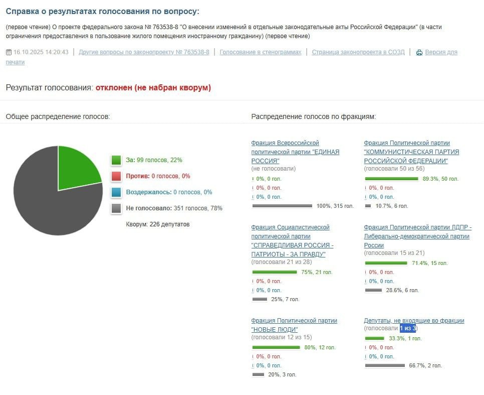 А ловко вы это придумали, канешно. Остальные партии чет там суетят и бегают, но это не имеет абсолютно никакого значения. Потомушта если ЕдРо не голосует, то закон не проходит. И карачун.