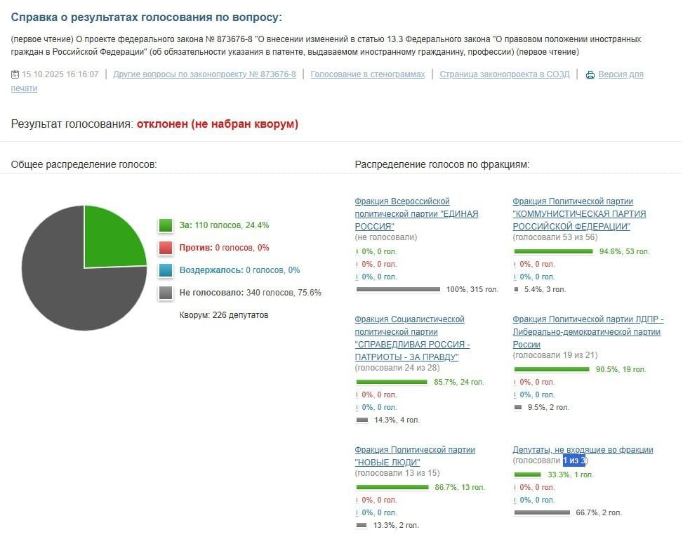 (об обязательности указания в патенте, выдаваемом иностранному гражданину, профессии) (первое чтение) http://vote.duma.gov.ru/vote/132261