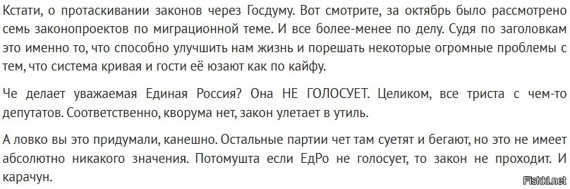 Кстати, о протаскивании законов через Госдуму. Вот смотрите, за октябрь было рассмотрено семь законопроектов по миграционной теме. И все более-менее по делу. Судя по заголовкам это именно то, что способно улучшить нам жизнь и порешать некоторые огромные проблемы с тем, что система кривая и гости её юзают как по кайфу.