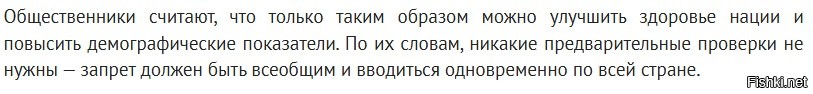 Общественники считают, что только таким образом можно улучшить здоровье нации и повысить демографические показатели. По их словам, никакие предварительные проверки не нужны — запрет должен быть всеобщим и вводиться одновременно по всей стране.