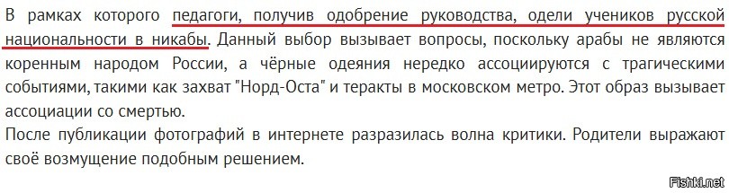В рамках которого педагоги, получив одобрение руководства, одели учеников русской национальности в никабы. Данный выбор вызывает вопросы, поскольку арабы не являются коренным народом России, а чёрные одеяния нередко ассоциируются с трагическими событиями, такими как захват "Норд-Оста" и теракты в московском метро. Этот образ вызывает ассоциации со смертью.
