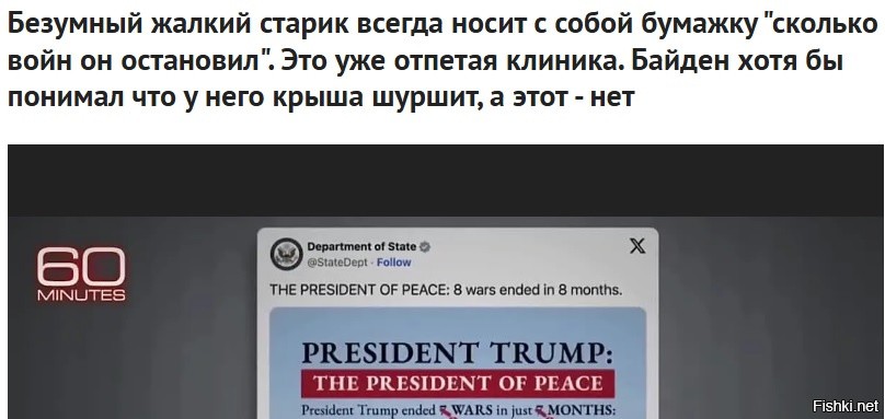 Безумный жалкий старик всегда носит с собой бумажку "сколько войн он остановил". Это уже отпетая клиника. Байден хотя бы понимал что у него крыша шуршит, а этот - нет