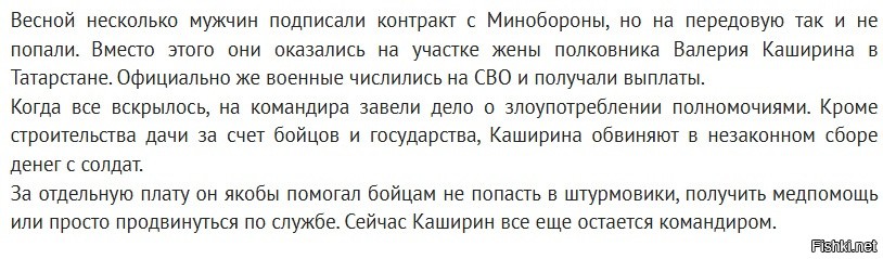 За отдельную плату он якобы помогал бойцам не попасть в штурмовики, получить медпомощь или просто продвинуться по службе. Сейчас Каширин все еще остается командиром.