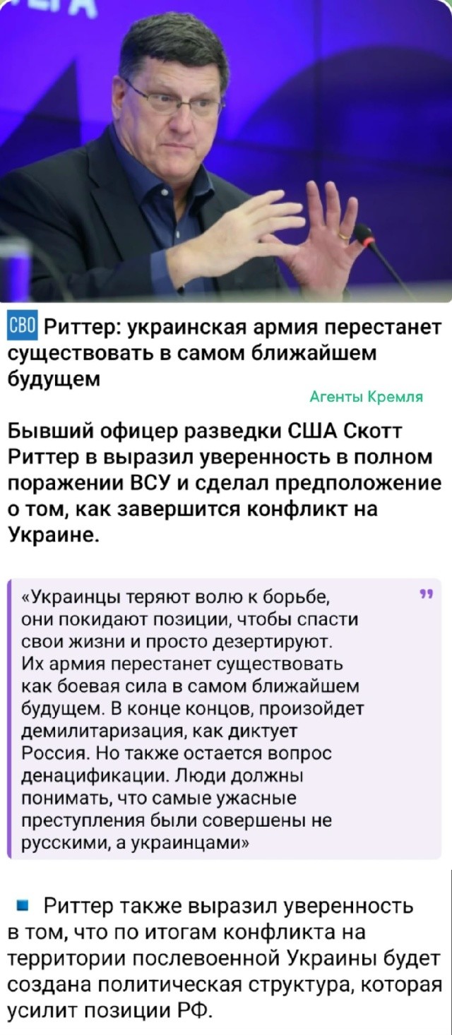 Кратко. Риттер: - Я бывший разведчик-аналитик, работавший по СССР. Разведчики бывшими не бывают. Я всегда тружусь на благо США. Они всегда будут на первом месте. НО!