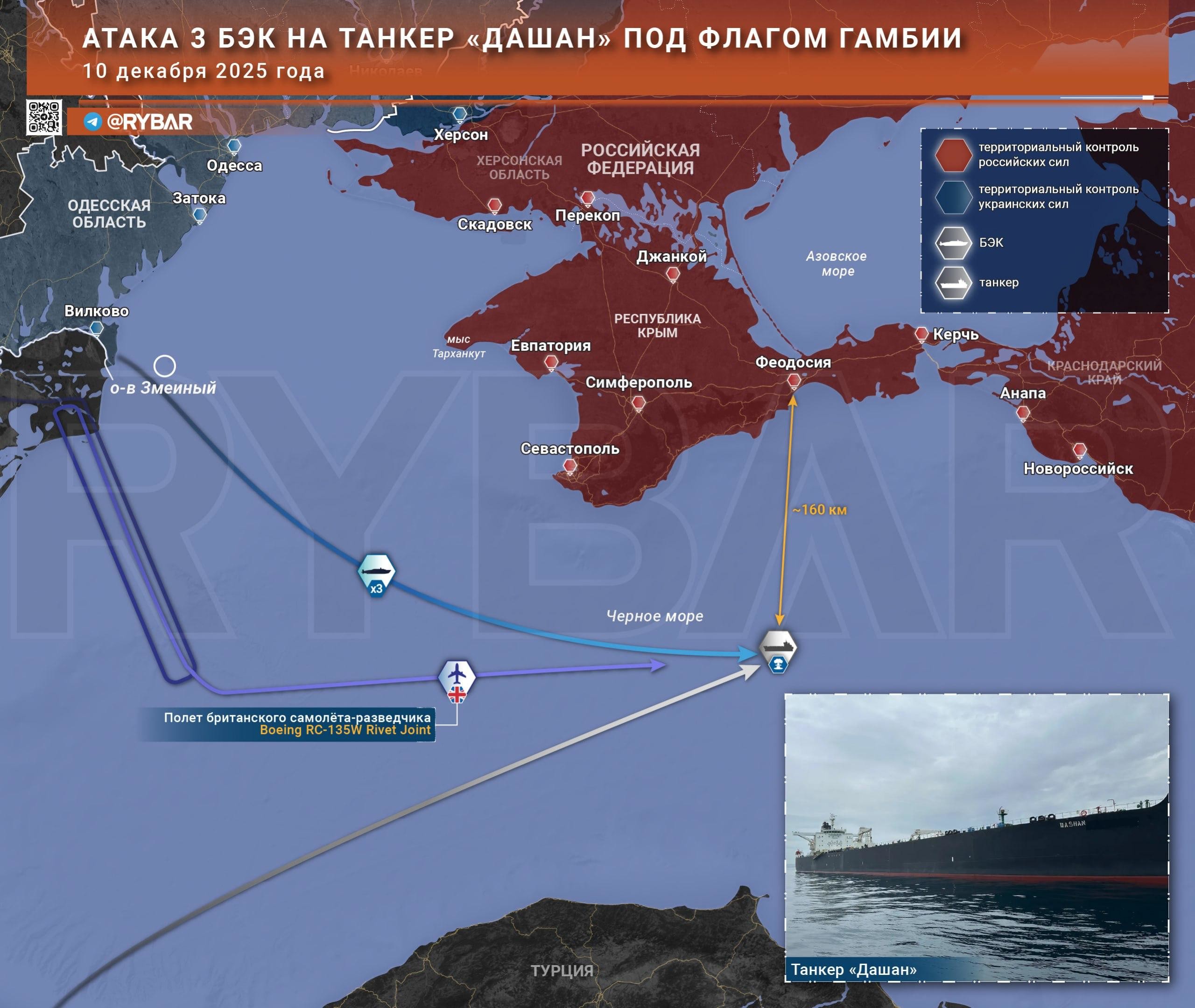 Без-экипажные катера противника атаковали нефте-танкер “DASHAN” под флагом Гамбии. Судно, которое на Западе считают принадлежащим к так называемому «теневому флоту», шло под загрузку в порт Новороссийска. Танкер может быть выведен из строя.