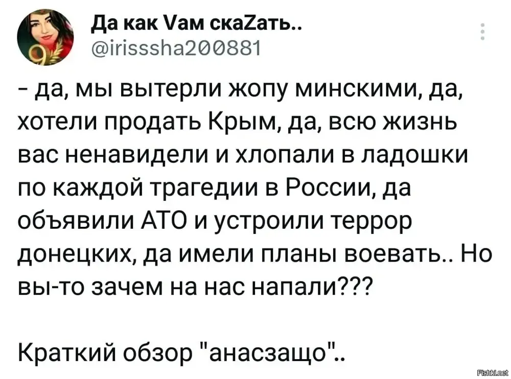 «Заявление Сибиги — это своеобразное преломление украинского подхода, что нам можно всё, а если нам отвечают, то следует вопрос: а мене-то за шо? Как в анекдоте: "Пойдём, дадим в морду русскому. А если он ответит? А меня-то бить за что?" Это реакция людей, которые до этого привыкли действовать безнаказанно, а тут кто-то их одёргивает, а раз одёргивает, значит, показывает их настоящее лицо. Они к этому не привыкли, они хотят это пресечь, они хотят и дальше оставаться, как жена Цезаря, вне подозрений», — резюмировал эксперт.