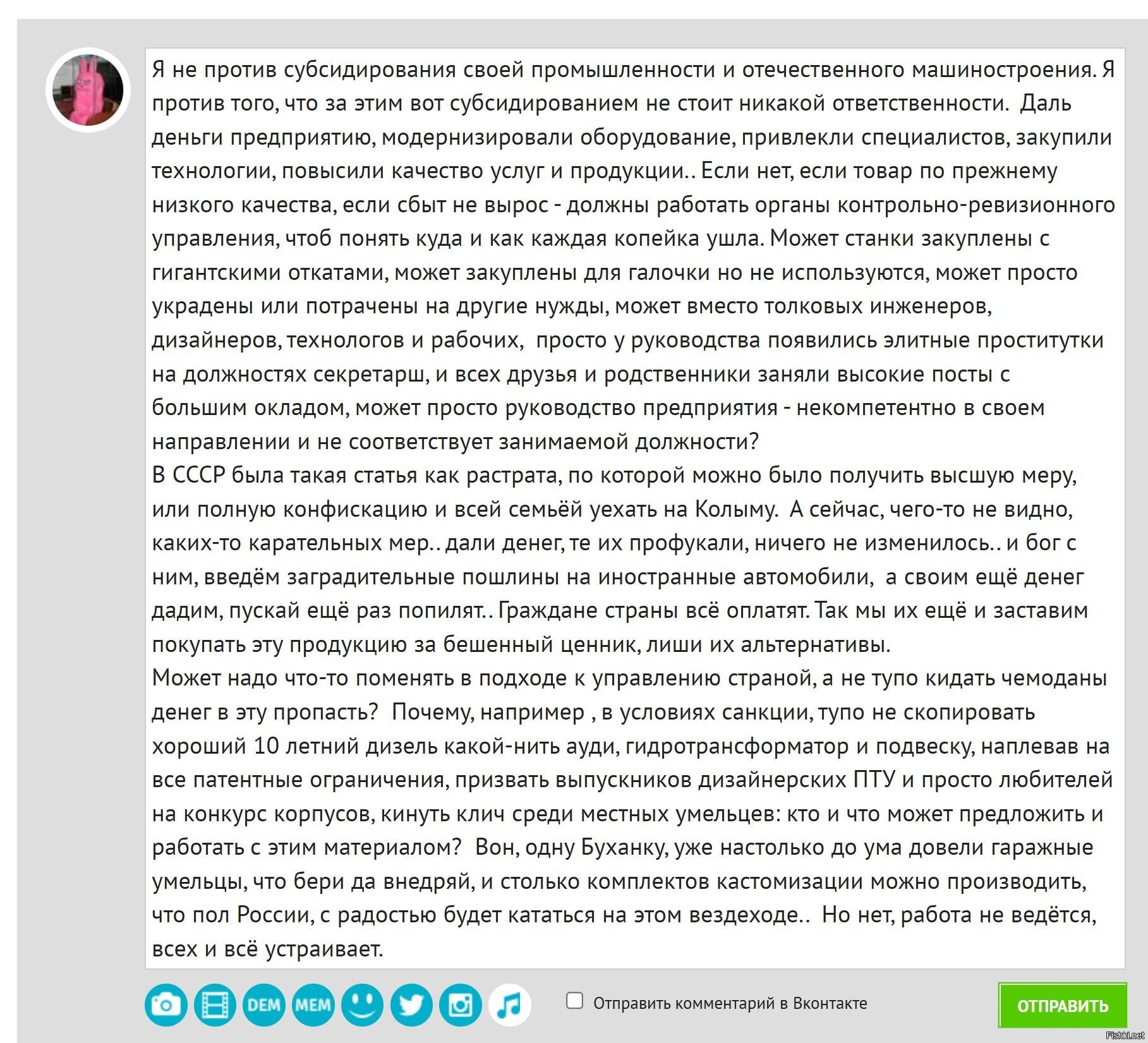 А про поддержку и гос вливание в нашу автомобильную промышленность, на мой взгляд лучше делать вливание через покупателей, например покупаешь автоваз, тебе 90% государство гасит и 10% твоих, продажи только от производителя, без посредников или строго по РРЦ+фиксированный процент для автосалона.