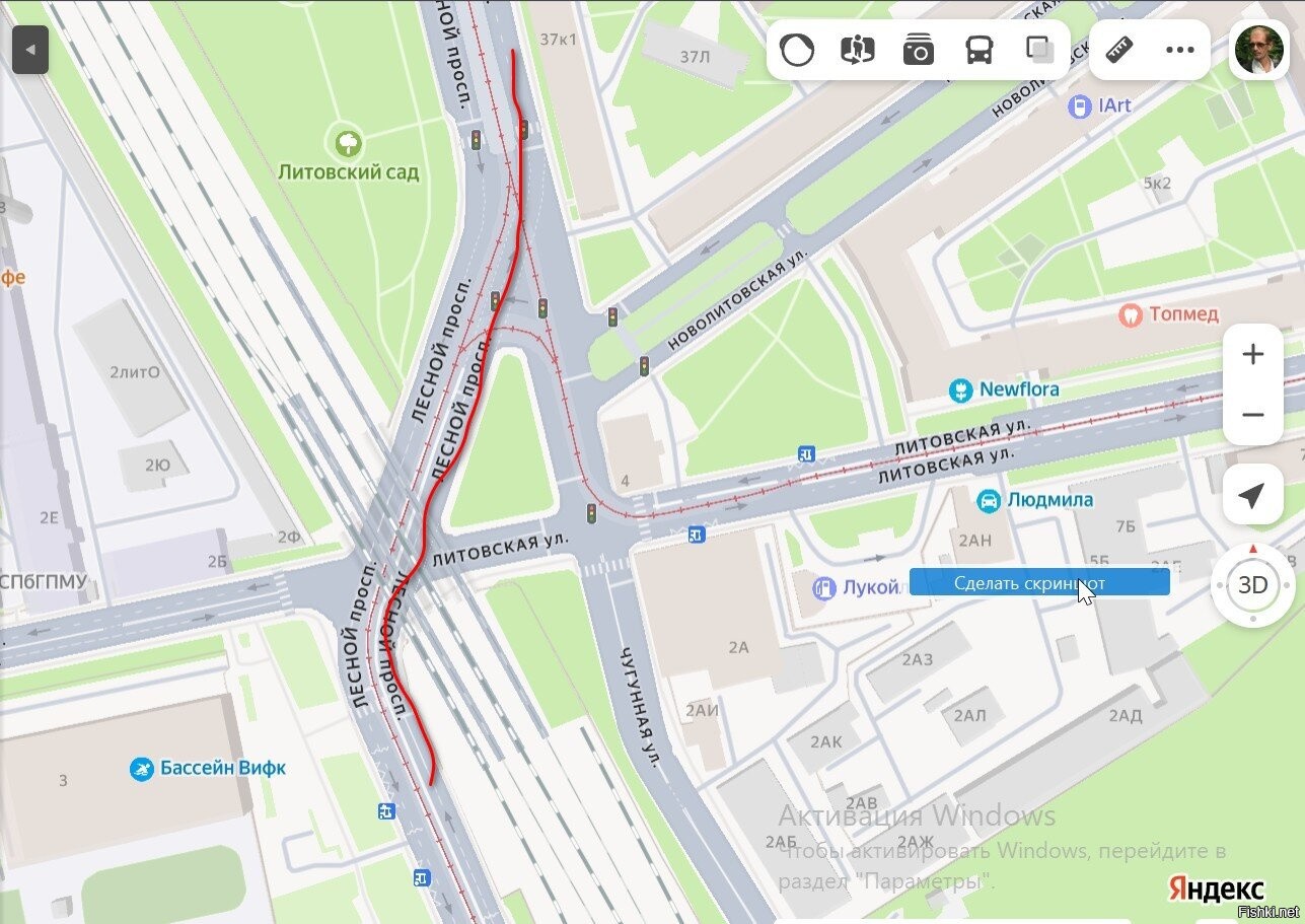 Автор едет по Лесному проспекту пересекая Литовскую ул. в направлении Диагональной ул. До ближайшего поворота на лево 1,5 км