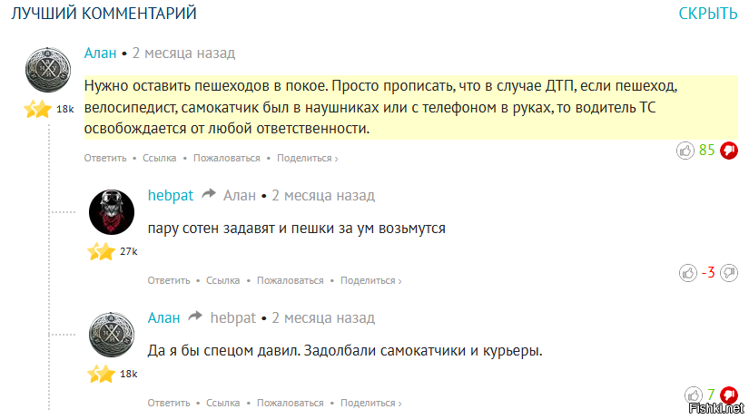 Если в стране, где была сделана запись, такое правило в ПДД есть, самокатчик его нарушил. Пешехода водитель бы не сбил, т.к. пешеходы не могут выскочить так же быстро, как велосипедисты или самокатчики. А отсутствие фуры он проверил.