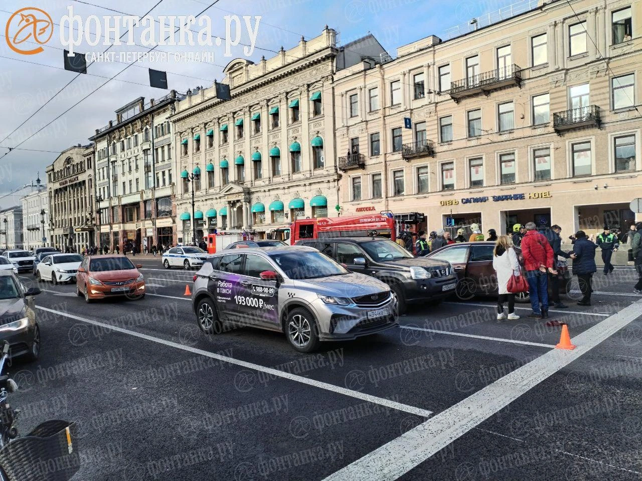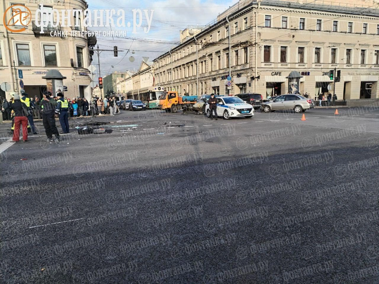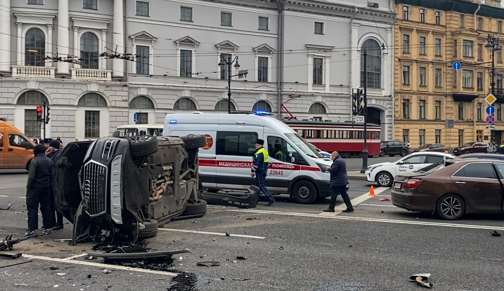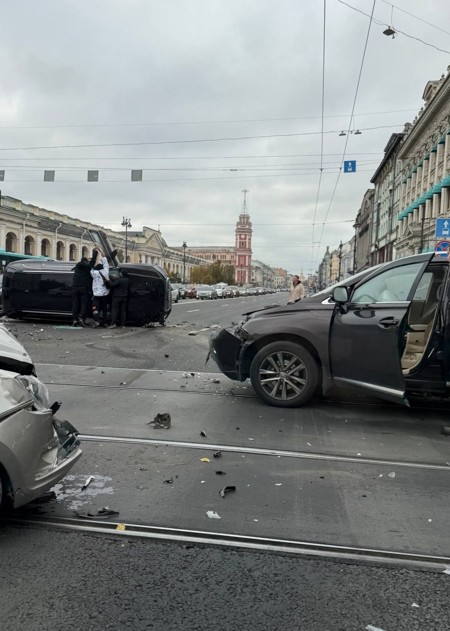 Эпичная авария из пяти машин произошла в центре Питера. Водитель "Ауди" решил проскочить на красный и устроил массовое ДТП: в него въехали по две машины с каждой стороны, а сам водитель перевернулся от столкновения. Также пострадала женщина.