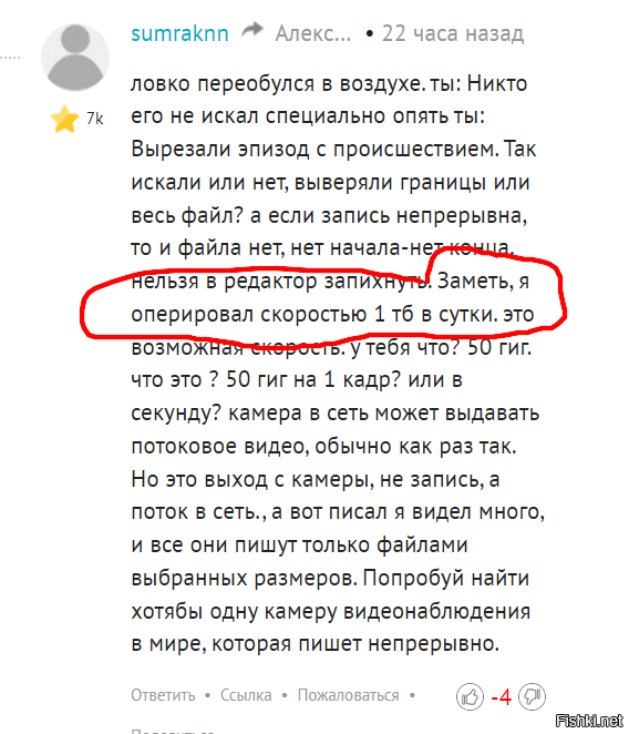 саша. камера пишет со скоростью 1 террабайт в сутки, за полгода 200 Тб. А когда просят скинуть, ну 200 террабайт на флэшку. Даже школота , даже дети знают как пишеться видеонаблюдение, а ты мало того что облажался как детсадовец, так еще с поучениями лезешь. И да, мое первое сообщение - сарказм. соседние ответы прочти и заминусы, обиженка.
