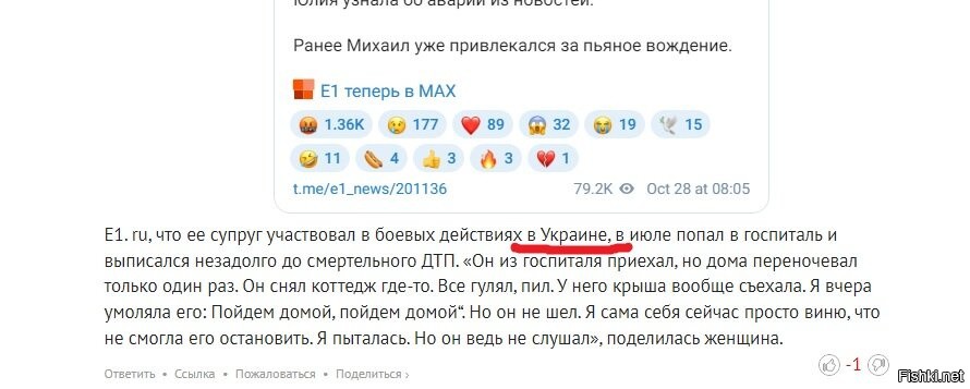 Жена Михаила рассказала ( Е1. ru, что ее супруг участвовал в боевых действиях в Украине, в июле попал в госпиталь и выписался незадолго до смертельного ДТП. «Он из госпиталя приехал, но дома переночевал только один раз. Он снял коттедж где-то. Все гулял, пил. У него крыша вообще съехала. Я вчера умоляла его: Пойдем домой, пойдем домой“. Но он не шел. Я сама себя сейчас просто виню, что не смогла его остановить. Я пыталась. Но он ведь не слушал», поделилась женщина.