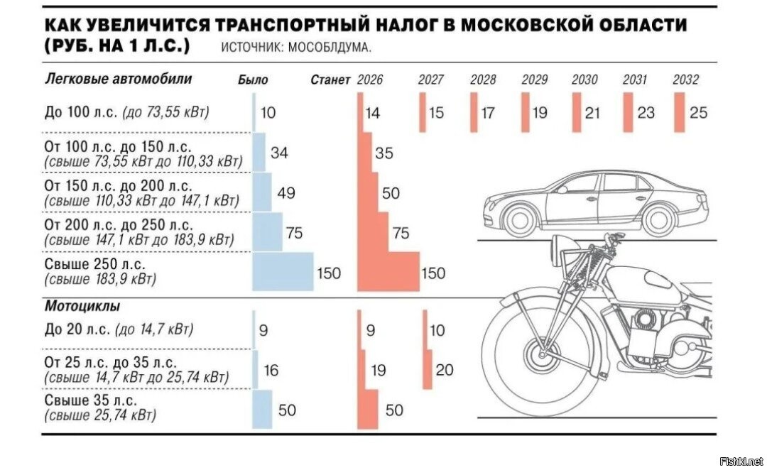 Для собственников легковых автомобилей мощностью до 100 л. с. ставка налога вырастет с 10 до 14 руб. в 2026 году и 25 руб. в 2032 году, следует из подсчётов «Коммерсанта». Владельцы мотоциклов мощностью 25-35 л. с. будут платить за «лошадь» не 16, а 20 руб. По итогам принятия закона власти Подмосковья рассчитывают собрать дополнительно ₽1 млрд.