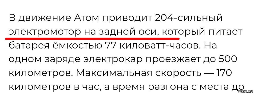 В движение Атом приводит 204-сильный электромотор на задней оси, который питает батарея ёмкостью 77 киловатт-часов. На одном заряде электрокар проезжает до 500 километров. Максимальная скорость — 170 километров в час, а время разгона с места до «сотни» — 8 секунд. Пополнение запаса энергии, чтобы её хватило на 100 километров, займёт 8 минут.