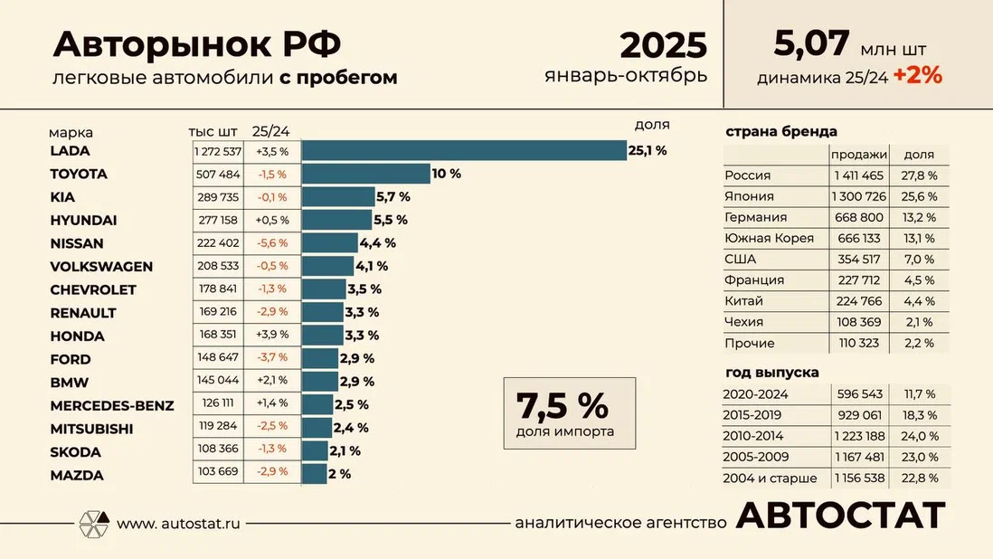 Ёмкость вторичного рынка легковых автомобилей за 10 месяцев 2025 года превысила 5 миллионов экземпляров. Как уточняет глава агентства «Автостат» Сергей Целиков, это чуть больше, чем за тот же период 2024 года. При этом топ-10 самых востребованных марок в сегменте состоит из так называемых традиционных брендов: ни одной марки из КНР в нём до сих пор нет.