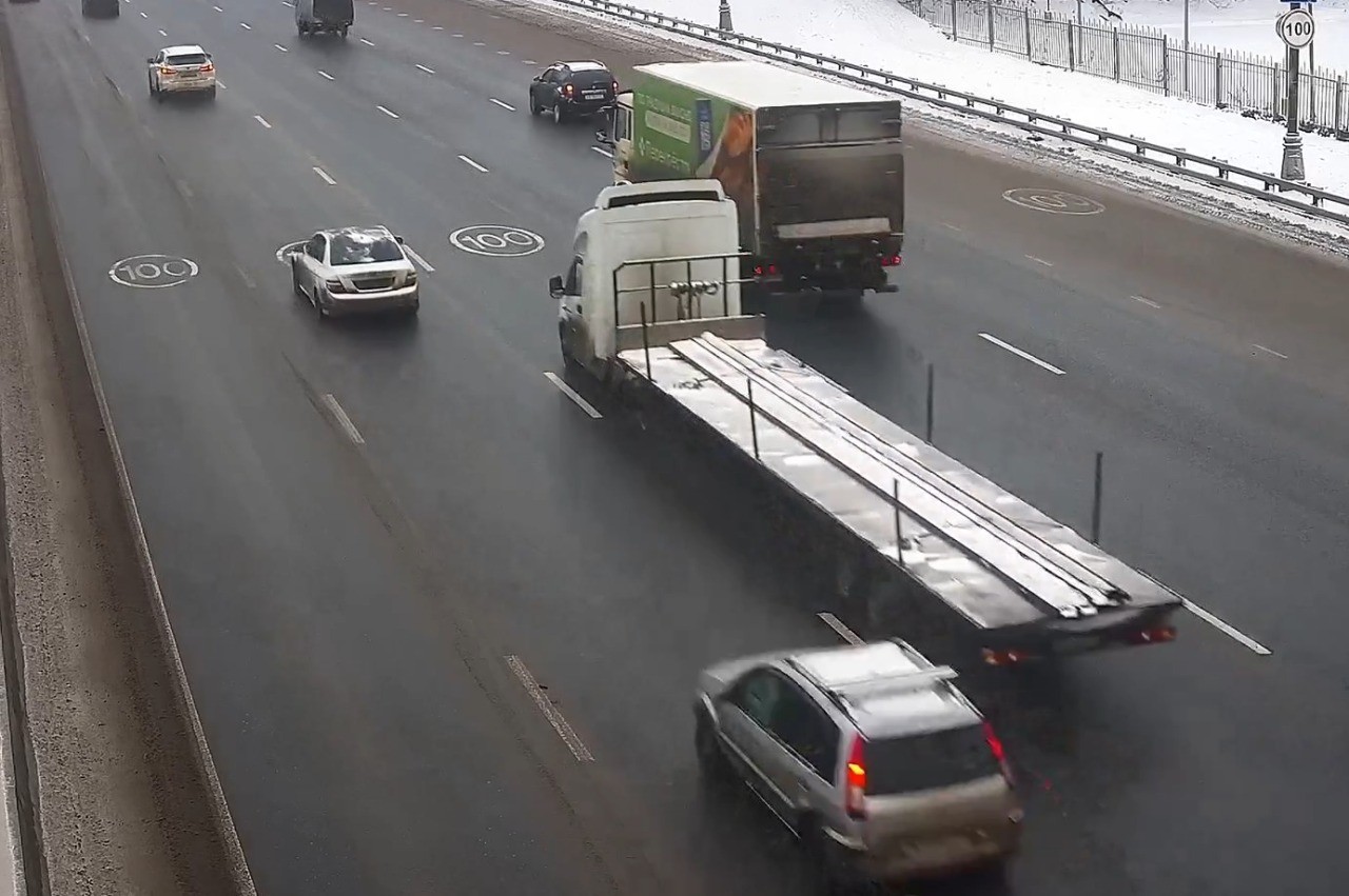 Дептранс опубликовал свежее видео со 105 километра внутренней стороны МКАДа. Легковой автомобиль столкнулся с попутным грузовиком. О пострадавших информации нет.