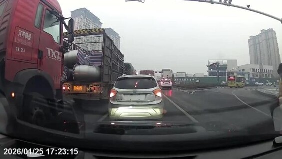 Отец с ребёнком в нарушение ПДД решили перейти многополосную дорогу и зашли они под грузовик. Судя по последующей реакции, они ещё и недовольны остались. Хэби, Китай.