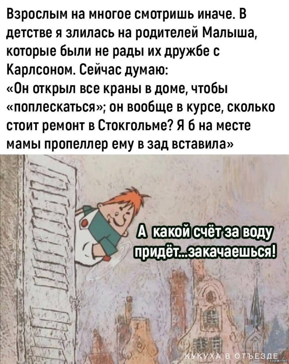 Самое веселое, что я с детства не был в восторге от Карлсона... Случаи с паровой машиной, люстрой и всеобщим бардаком мне никак не нравились... Этот паразит никогда не убирался в доме, а у нас с сестрой каждую субботу мытьё полов во всем доме, мечта о большой машинке, чтоб меня или хотя бы племянника выдерживала, да и водичку нам с Танькой приходилось с колонки возить... Кстати теперь большой игрушечный самосвал у нас постоянно... На нем возят детей лет до пяти...
