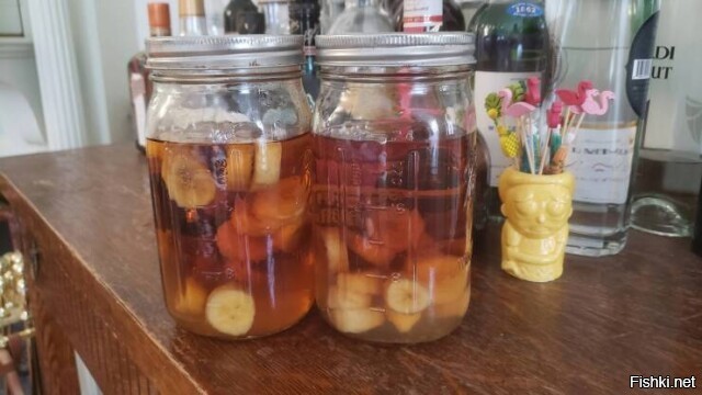 А можно рецепт ликера бананового в студию? Спрашиваю почему: потому, что месяц выдержки в фольге в холодильнике привел к тому, что в новогодние праздники в застолье откупорили это чудо, выпили по рюмке и в итоге женская половина этот напиток у нас отобрала под угрозой расстрела. Получился довольно сладкий напиток, дамам зашел на ура! Никакой ликер даже и не предполагался. Просто хорошо выгнанный самогон 55 + бананы.