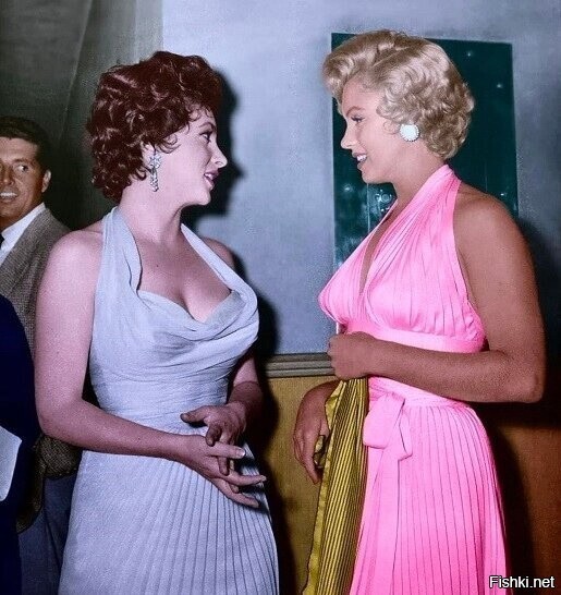 Эпизод, запечатленный на предлагаемом фото, когда Мэрилин Монро, не дожидаясь официального представления, направилась к Лоллобриджиде, чтобы познакомиться и завязать беседу.