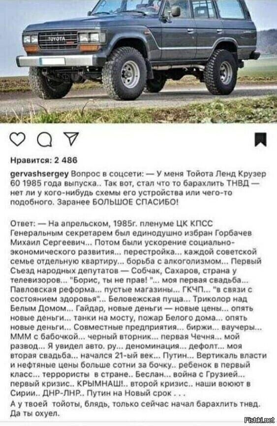 На апрельском, 1985г. пленуме ЦК КПСС Генеральным секретарем был единодушно избран Горбачев Михаил Сергеевич... Потом были ускорение социально-экономического развития... перестройка... каждой советской семье отдельную квартиру... борьба с алкоголизмом... Первый Съезд народных депутатов - Собчак, Сахаров, страна у телевизоров... 'Борис, ты не прав!'... моя первая свадьба... Павловская реформа... пустые магазины... ГКЧП... 'в связи с состоянием здоровья'... Беловежская пуща... Триколор над Белым Домом... Гайдар, новые деньги - новые цены... мама умерла... опять новые деньги... танки на мосту, пожар белого дома... опять новые деньги... Совместные предприятия... биржи... ваучеры... МММ с бабочкой... черный вторник... первая Чечня... мой развод... отец умер... я увидел авто.ру... деноминация... дефолт... моя вторая свадьба... начался 21-ый век... Путин... ребенок в первый класс...