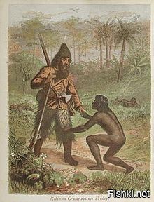 "Исследуя остров в течение многих лет, Крузо обнаруживает следы дикарей-каннибалов, которые иногда посещают разные части острова и устраивают людоедские пиршества. В одно из таких посещений он спасает пленного дикаря, которого собирались съесть. Он учит туземца английскому языку и называет его Пятницей, так как спас его именно в этот день недели. Крузо выясняет, что Пятница родом с Тринидада, который можно увидеть с его острова, и что он был захвачен в плен во время сражения между индейскими племенами."