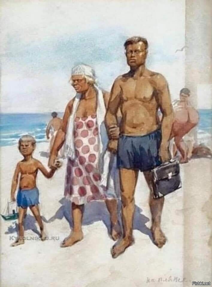 «Третий день любуюсь картинкой. В ней прекрасно все — мужик в труселях, но с портфелем, и баба с лицом сгоревшего на солнце киллера, и рахитичный ребенок с больными ногами разного размера. Но голая жопа на заднем плане — лучше всех. Я не знаю, что хотел сказать автор, и как это сочетается с законами соцреализма и кодексом строителя коммунизма, но она занимает треть картины и еще к ней присобачено лицо»