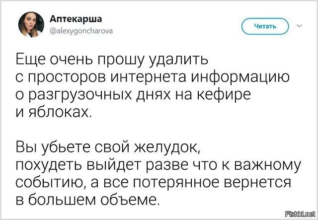 А вот про то, что она называет "разгрузочные дни" - я это называю монодиетой, и (вот как раз) на яблоках я сбрасывал кило за день. Ешь только один продукт, сколько захочется, вода - без ограничений.