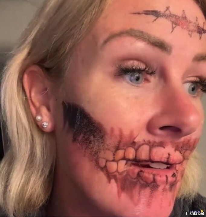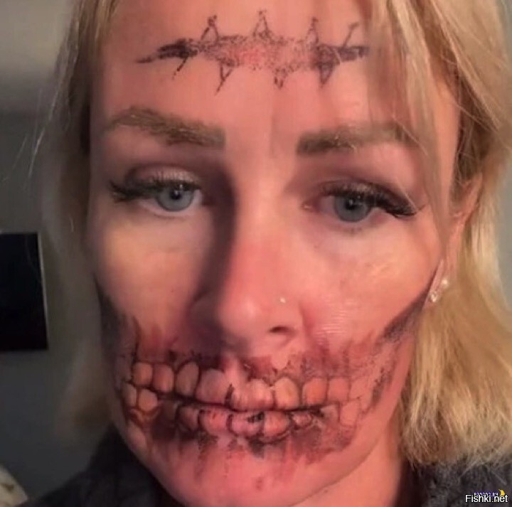 46-летняя Элизабет Роуз из Великобритании решила порадовать внуков на Хэллоуин необычным образом, для чего нанесла на лицо временные татуировки-переснимки. Как бы рот как у черепа, а на лоб шрам со швами.