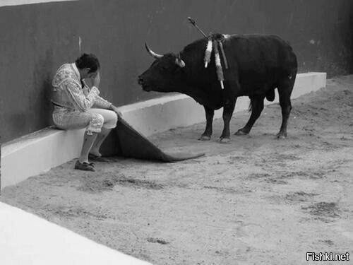 Это удивительное фото ознаменовывает окончание карьеры тореро Альваро Мунера. Во время боя он упал на арену, осознав, что раненый бык не намерен атаковать человека. Сам Мунера поделился своими мыслями об этом моменте: "И вдруг я взглянул в глаза быка. Они молились передо мной. Это было как призыв к справедливости. Я бы охарактеризовал это как своего рода молитву. Я чувствовал себя ничтожеством на земле". После этого инцидента Альваро Мунера начал вести кампанию за запрет быковых боев.