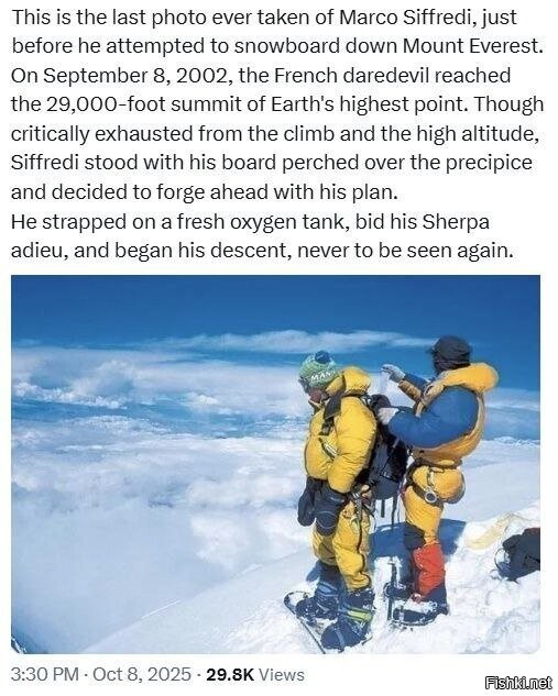 Слева 23-летний француз Марко Сильфреди, который 8 сентября 2002 года решил стать первым человеком в мире, кому удалось съехать с вершины Эвереста на сноуборде. После восхождения он совершенно выбился из сил, но решил все-таки не отказываться от мечты, поэтому взял запасной кислородный баллон, помахал ручкой проводнику-шерпе и помчался вниз.