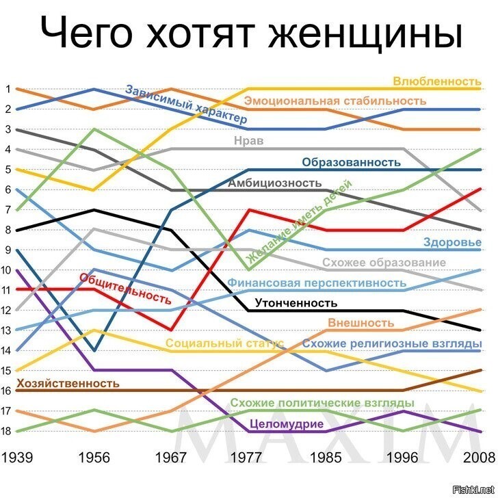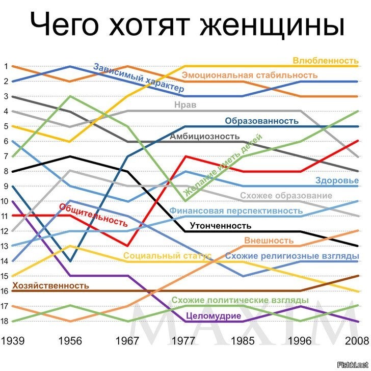 Статистику о приоритетах социологи начали аж в 1939 году. Респондентов на протяжении более семидесяти лет просили расставить приоритеты в партнере противоположного пола в порядке предпочтения. (Редакция просит прощения за большое количество слов на букву П подряд в предыдущем предложении, да и в этом тоже.)