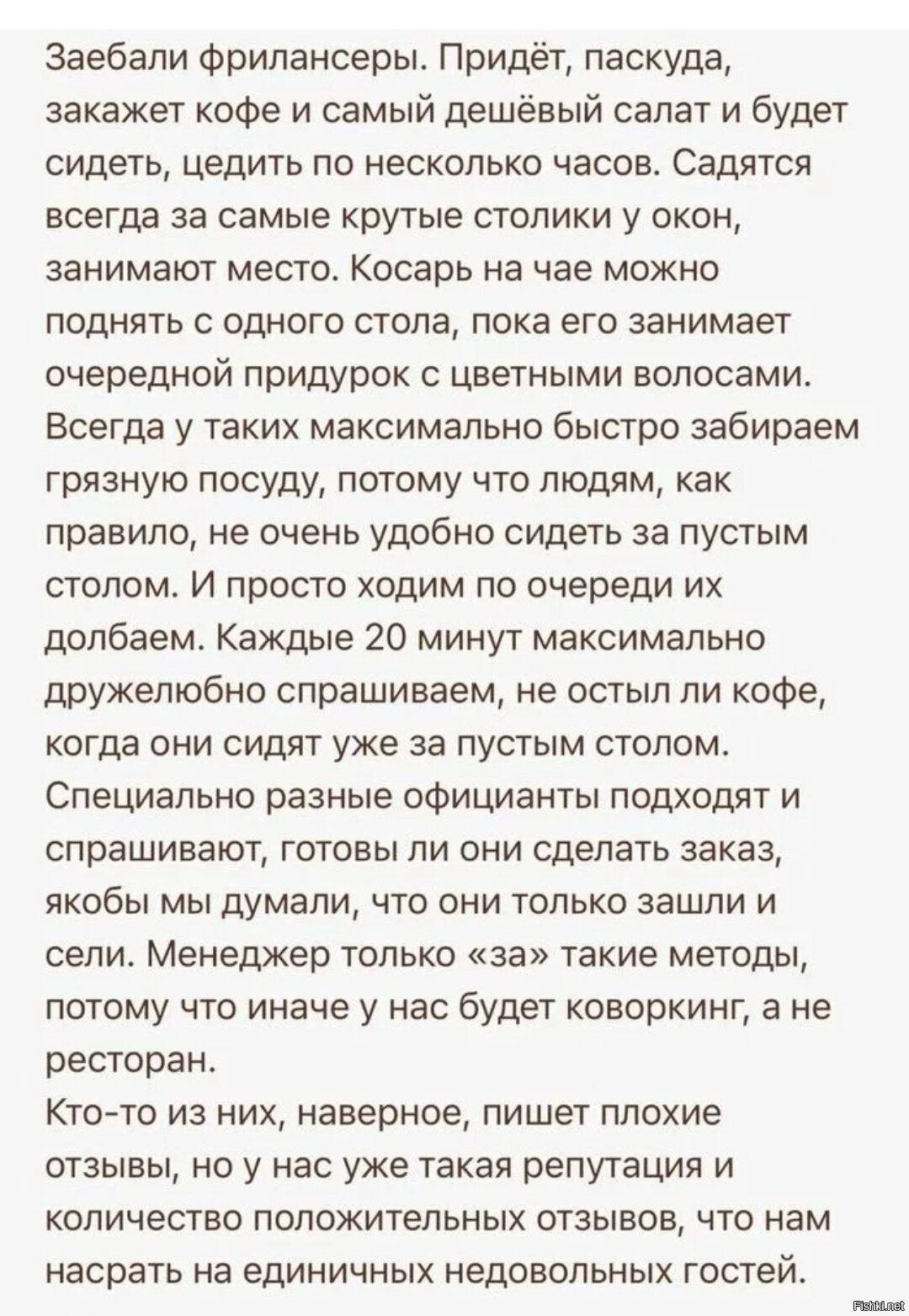 Деточка, во-первых, ни один 'фрилансер ' не пойдёт в ресторан пить кофе. Да и вообще ни один кофеман- в ресторанах, даже (тем более) пафосных, кофе максиму на троечку. Да смысл идти в именно ресторан за салатиком и кофе, если за эти деньги можно выпить и кофе, и вполне годный обед. Поэтому перестаньте себя рестораном называть, вы недорогое кафе с приличным кофе.