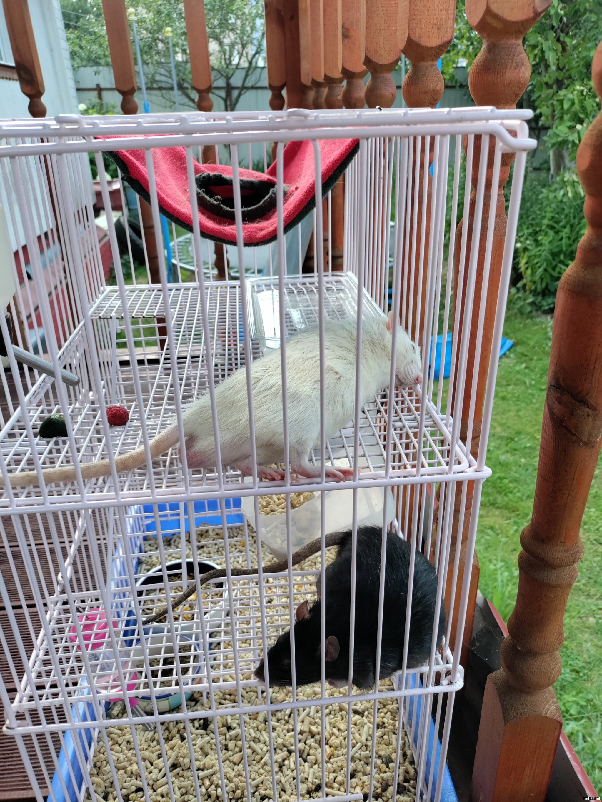 Ты про видео? Тогда был черный, но на старости лет белый стал его гонять. Так мирно жили, но если дать одну кукурузу - теряют человеческий облик. Летом черный помер, купили серого (на фотке у елки). Теперь белый альфач, но серый растет и явно будет шустрее. Пока держим в разных клетках.