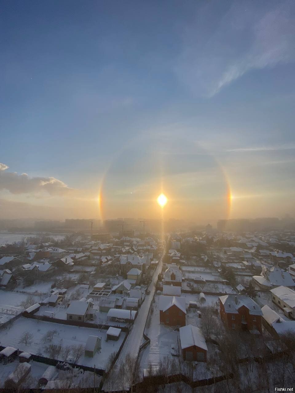 22 гало, солнечный столб, паргелии, частично виден паргелический круг(?) и намечается верхняя касательная дуга(?).