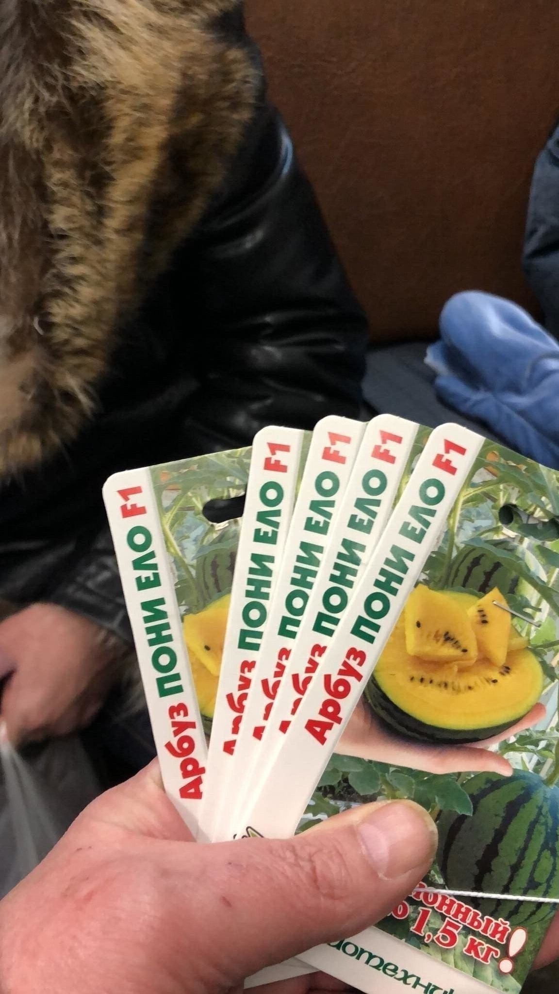 Купил таки жене семена чудного порционного арбуза. Так ещё и желтого. Давно искали. Пришлось на авиамоторную после работы заехать.