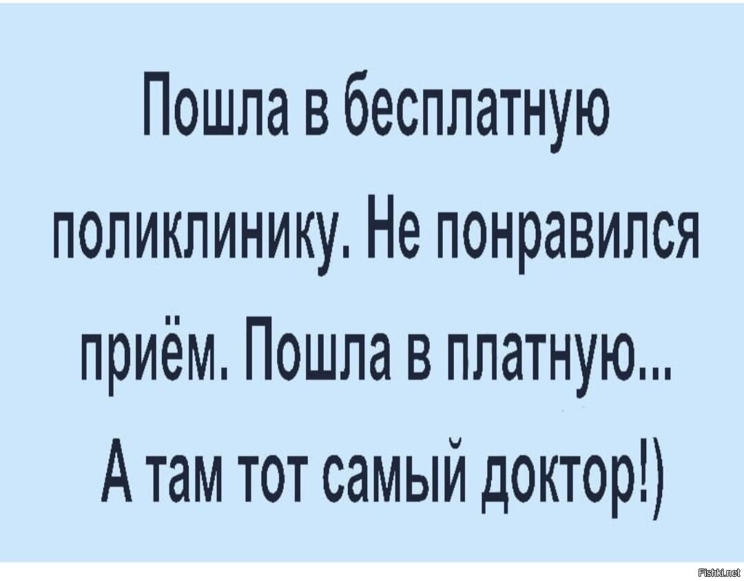 У нас в поликлинике 2 врача. Один хороший, платный, другой плохой, бесплатный. И оба я.