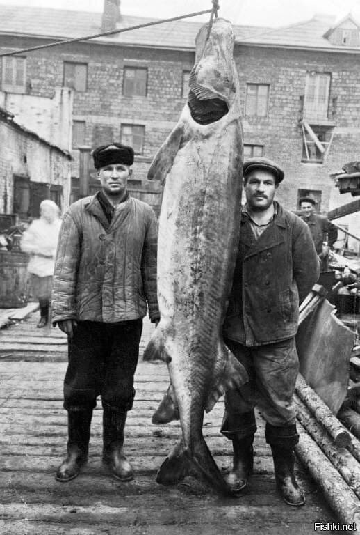 На фотографии: пойманная в реке Вятке у села Вишкиль белуга, 250 кг., 2,5 метра. 1961 год.