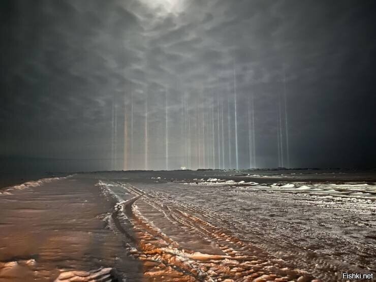 "Световой лес". Резкое похолодание, в воздухе повисают мелкие кристаллы льда "алмазная пыль". Игра света на них и даёт такой эффект.