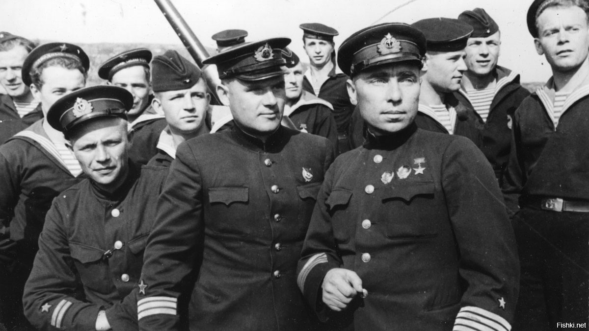 Ближний в кадре — командир подлодки Герой Советского Союза капитан 2-го ранга Николай Александрович Лунин (1907—1970). Справа налево (от капитана): военком Сергей Александрович Лысов, командир минно-артиллерийской части БЧ-2-3 Владимир Леонардович Ужаровский.