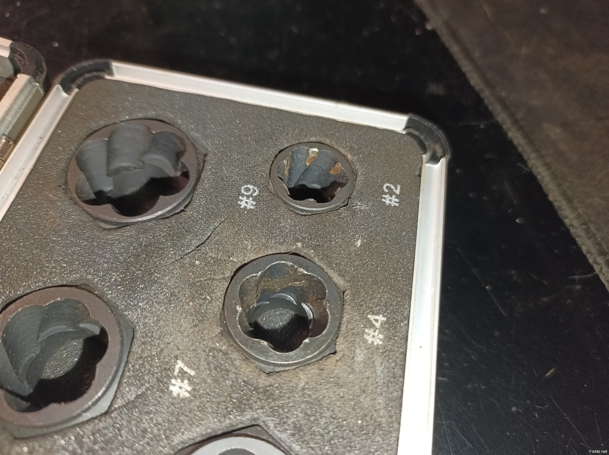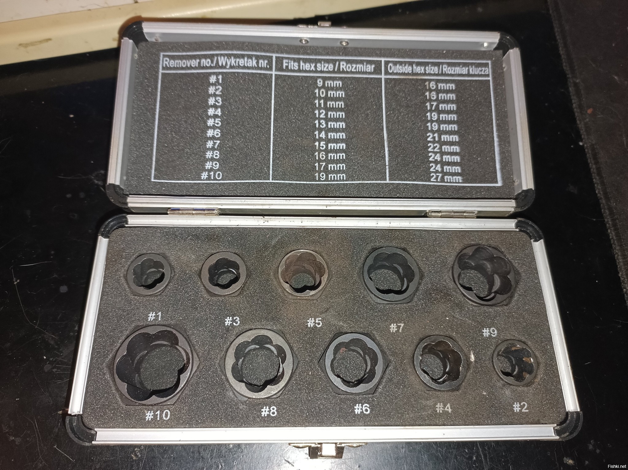 Так же есть такой набор. Он очень пригодился, когда откручивал гайку приёмной трубы (штанов) на Шниве. Кто-то до меня закрутил её не по резьбе. Виду того, что эта гайка находится в оооочень неудобном месте, кроме как этим съёмником её никак было не открутить. Да, гайка открутилась, но съёмник более непригоден, так как сделан из пластилина .