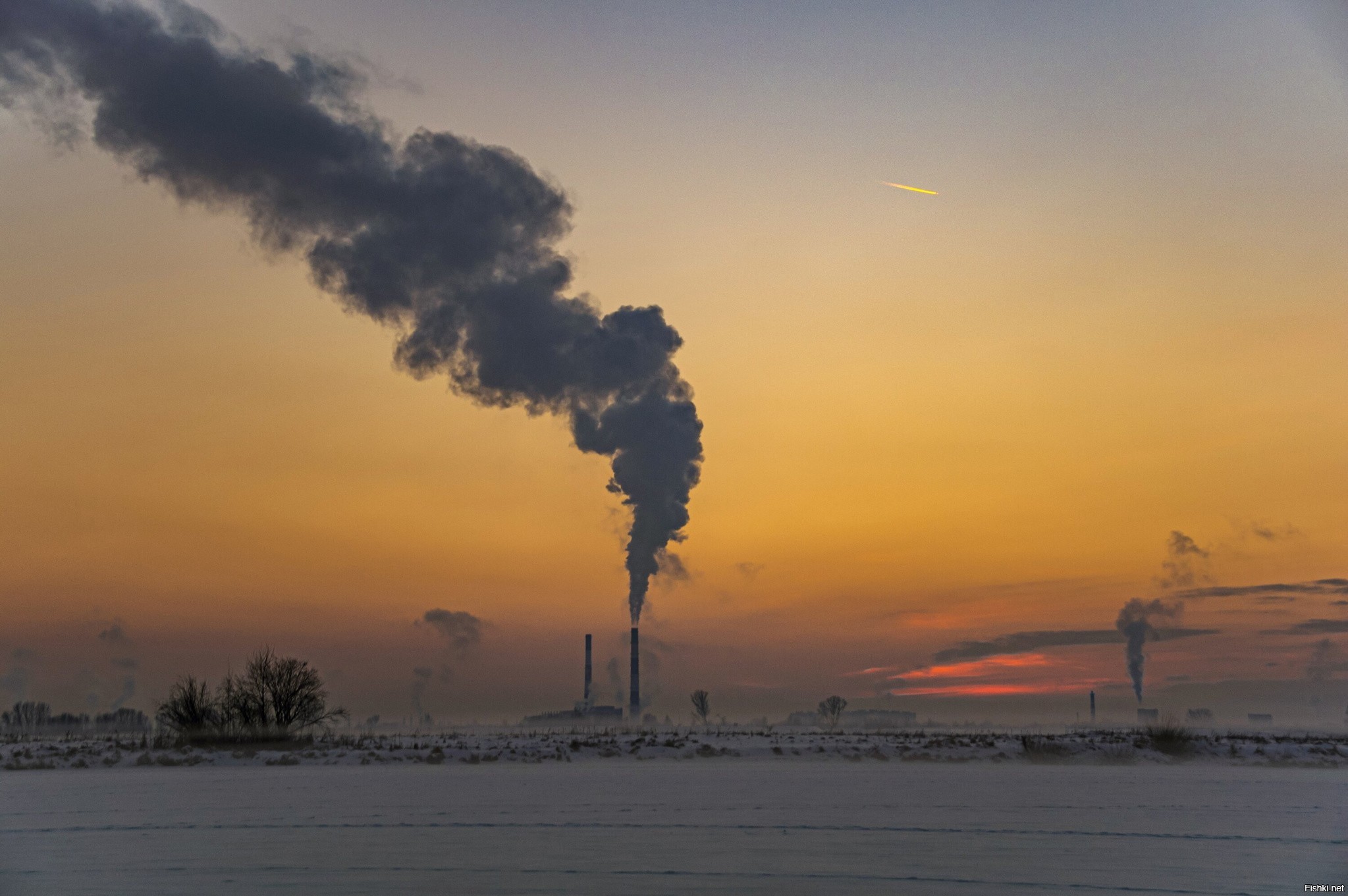 дым из труб стелется по земле — к снегопаду;