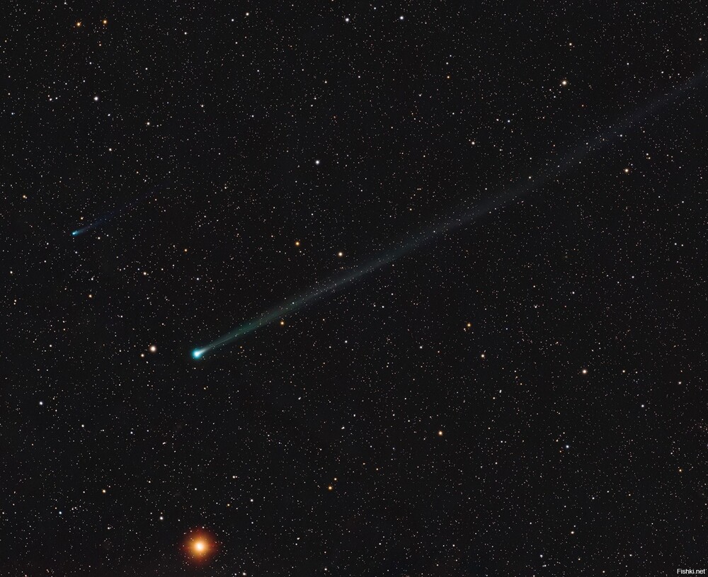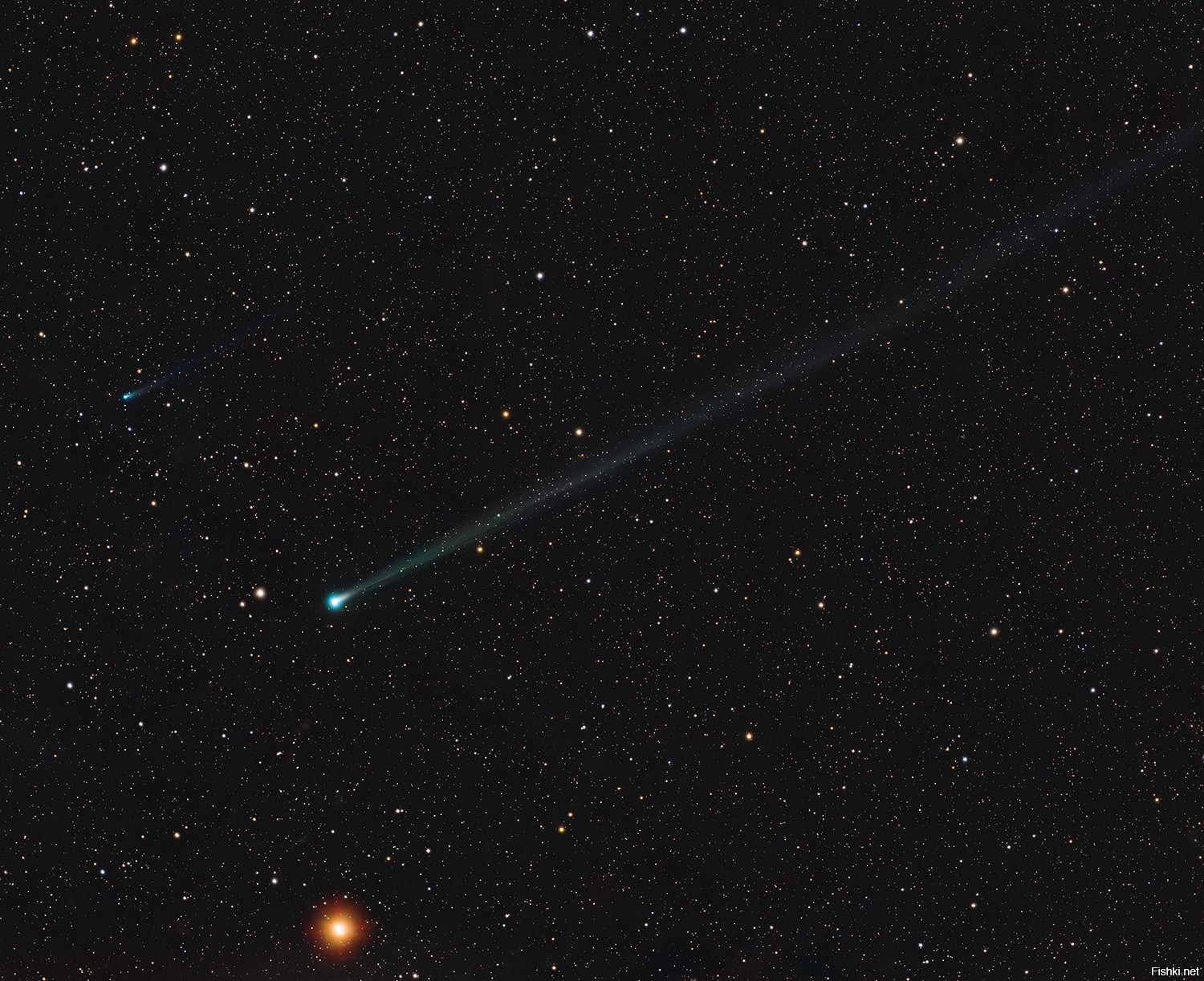 Более тусклая комета, также впервые посещающая внутреннюю Солнечную систему – C/2025 K1 (ATLAS), она видна выше и левее зеленоватой комы яркой кометы SWAN на фоне множества звезд созвездия Девы. Эти кометы были открыты в 2025 году, рядом с ними оказалась красноватая планета Марс (внизу) – более знакомый странник на ночном небе планеты Земля.