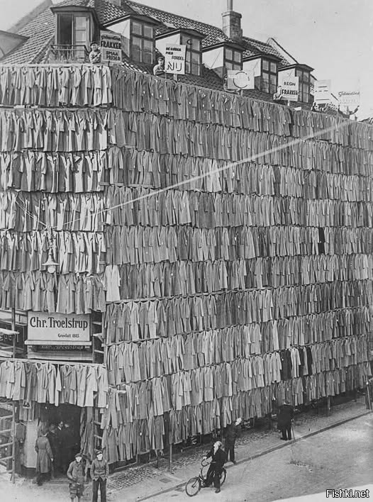 Затоварившийся мужскими демисезонными и зимними пальто продавец одежды придумал рекламный трюк. Он окружил свой универмаг строительными лесами и обвесил его с крыши до тротуара более чем тысячей пальто.