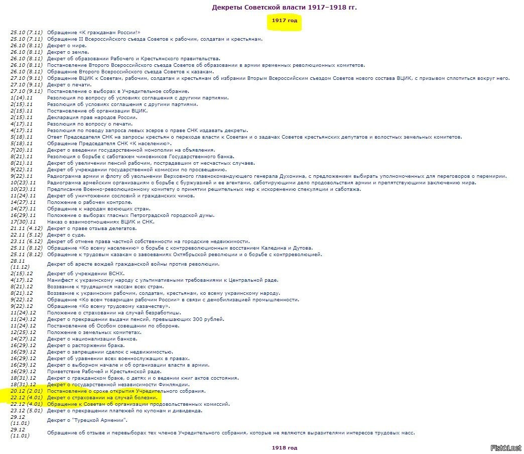 27 (14) ноября 1917 года,Советом народных комиссаров РСФСР (СНК-совнарком,это как сейчас правительство) был принят Декрет «О пособии по беременности и родам».А у тебя "декрет о страховании на случай болезни" и принят он ВЦИК (Центральный исполком,законодательный орган типа Госдумы) 22 декабря.Это разные документы,принятые разными органами власти.