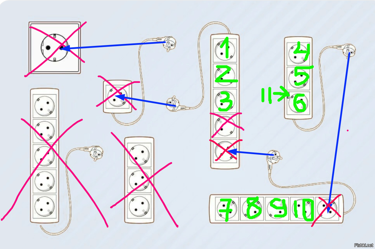 Если розетка американская (120V), а зарядники с повышением напряжения 20V - то не более шести телефонов.