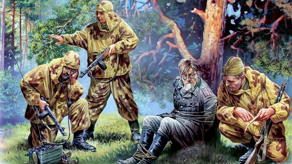 это укороченные сапоги, а не берцы. рацию пёрли - без неё никак, если задание было сведения передать оперативно. вещмешки? так они, может, левее, правее или на переднем плане, который не попал в композицию. а где же пресловутое про художника, который видит так, как видит. ситуация выглядит натянуто, но, с точки зрения композиции - достаточно выверенно. так-то и красной звёздочки на пилотке не должно быть и оружие, скорее всего не ППШ было, МП-40 логичнее в тылу у немца