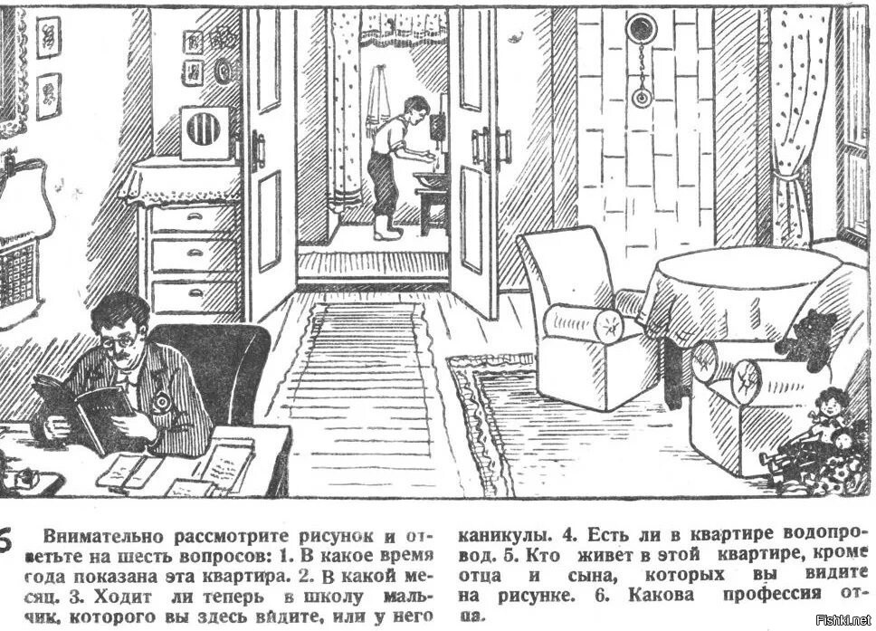 Скорее первый лист. Обложка наверх завернута, я такое раньше часто видел. И да, мальчик ходит в школу. Причем изображено утро, ибо отец читает книги, самоподготовкой занят перед работой (инструмент приготовлен, чтобы не забыть взять с собой), а мальчик умывается перед сном (штаны одеты, вечером бы полностью купался). Задвижка на печи открыта, чтобы не угореть ночью. И протопить квартиру перед сном.