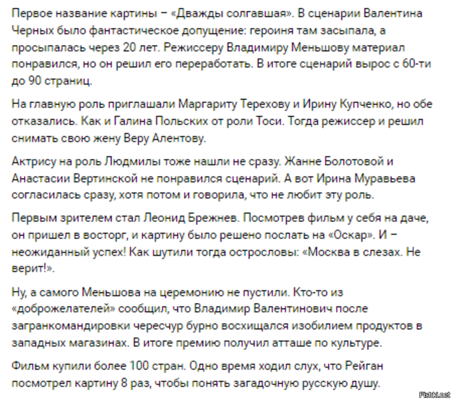 Классный фильм хотя есть некоторые моменты которые не очень впечатляют! Актеры подобраны очень к месту! Правда самая яркая роль у Муравьевой. Но во второй серии Баталов выходит на первое место. А Алентова не блистает. Но как и все сказки про Золушку этот фильм очень хорош! Спасибо Меньшову! Молодец!