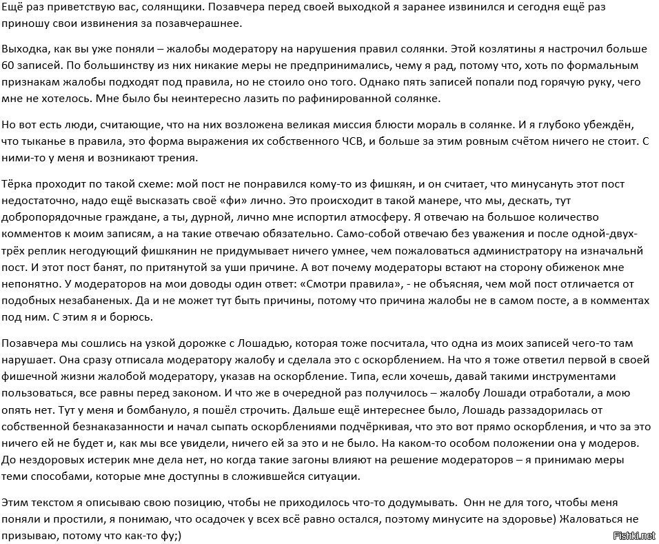 ! Флуд - дублирующиеся комментарии от одного и того же пользователя в разных постах, систематические ложные вызовы модераторов с помощью функции @moderator, необоснованные обращения в техническую поддержку сайта, комментарии не несущие смысловой нагрузки и состоящие из хаотичного набора букв. Санкции - предупреждение с дальнейшим баном при рецидиве.
